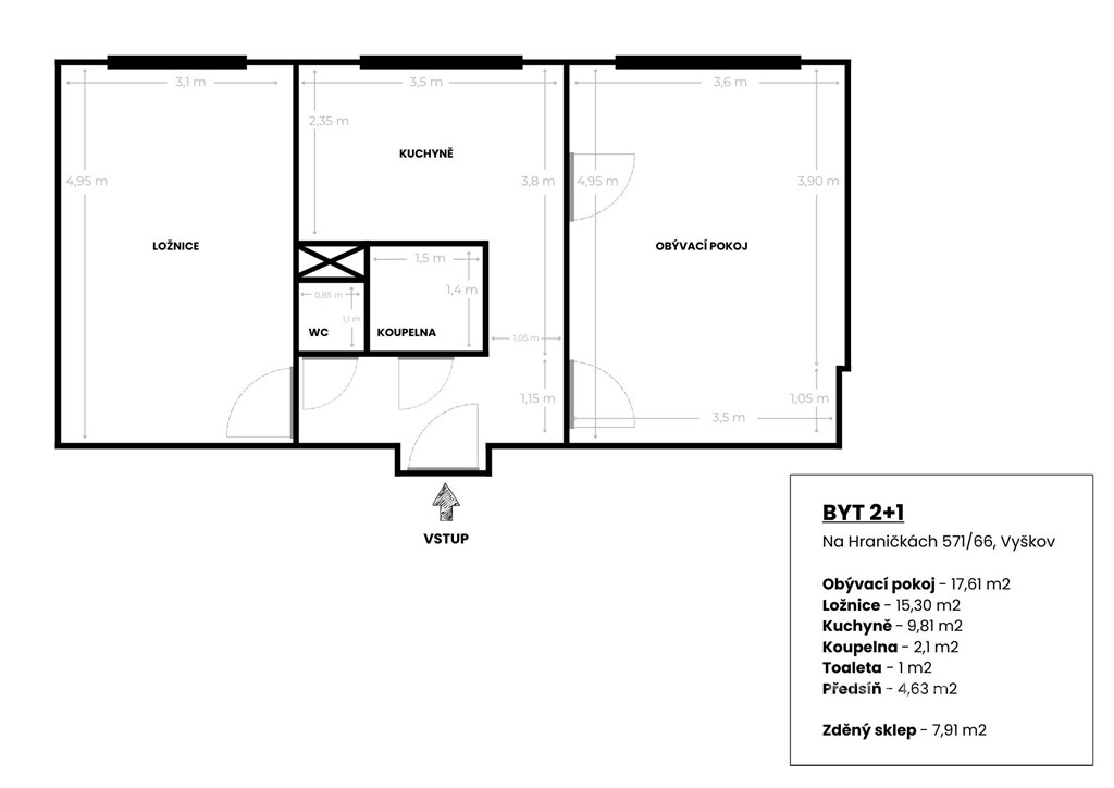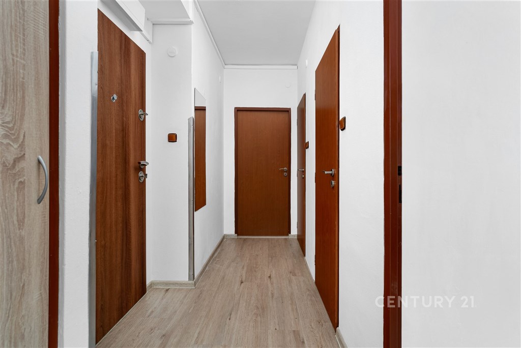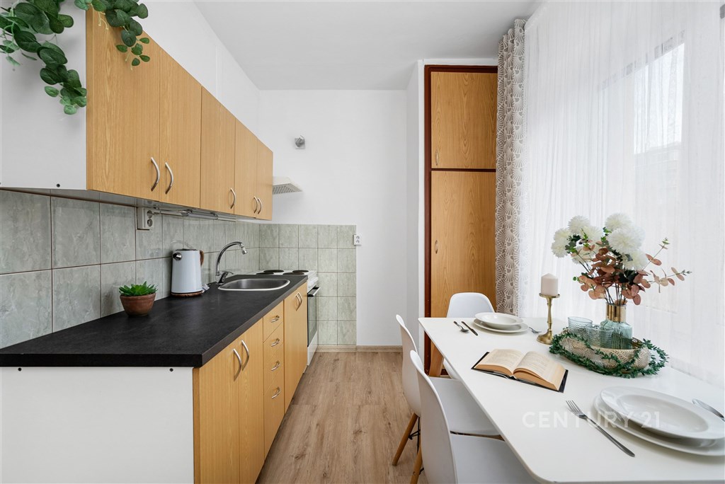 Léty prověřená dispozice, cihlový bytový dům, nízké měsíční náklady a nadstandardní úložný prostor… To jsou hlavní přívlastky, které nejlépe vystihují právě tento byt o dispozici 2+1, který je umístěný v cihlovém bytovém domě na ulici Na Hraničkách ve Vyškově. Byt je umístěn ve třetím nadzemním podlaží (2. patře) z celkem tří nadzemních podlaží bytového domu bez výtahu. Samotný byt disponuje plochou 50,45 m2. K tomu dále patří zděný sklep umístěný v prvním podzemním podlaží s plochou 7,91 m2. Byt je v původním stavu po dílčích modernizacích. Bytové jádro je umakartové. Elektrorozvody, rozvody vody a odpadů v bytě jsou původní. Poslední modernizací v bytě jsou vinylové podlahy, které jsou položeny ve všech místnostech. Navíc je byt opatřen bezpečnostními vstupními dveřmi. Kuchyně je vybavena kuchyňskou linkou s elektrickou varnou deskou, elektrickou troubou a digestoří. Dispozice bytu se skládá ze vstupní chodby, dvou pokojů, kuchyně, koupelny s vanou a oddělené toalety. Jednou z hlavních výhod bytu jsou bezesporu dva prostorné neprůchozí pokoje, díky kterým je efektivně využita celková plocha. Centrální bytové jádro s kuchyní pak nabízí možnost snadné úpravy dispozice při případné rekonstrukci. Díky orientaci na jihovýchod je byt zároveň dostatečně světlý. Topení a ohřev vody je zajištěno centrálně dálkově. Dle aktuálního předpisu plateb činí platby spojené s bytem celkem 3.964 Kč měsíčně včetně fondu oprav. Zálohové platby se skládají z 850 Kč elektřina, 700 Kč teplo, 340 Kč teplá voda, 200 Kč studená voda, 1.329 Kč příspěvek do fondu oprav, 545 Kč ostatní náklady. Byt, který dává smysl dnes a zároveň nabízí prostor pro vlastní vizi do budoucna - a právě v tom spočívá jeho největší hodnota. Ať už hledáte první bydlení, klidné místo pro život, nebo investici s potenciálem dalšího zhodnocení, tady můžete začít. Zavolejte mi a domluvte si prohlídku - byt je k dispozici ihned.
