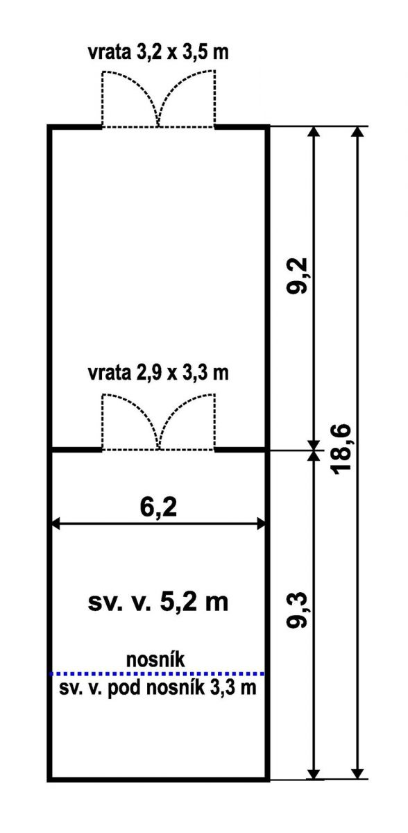 Pronajmeme halu využitelnou jako sklad nebo dílna o podlahové ploše 115 m2 v Hořicích, v bývalém areálu PENTAS. Jedná se o zděnou nevytápěnou halu, s vnitřními rozměry 18,6 x 6,2 m a světlou výškou 5,2 m. Podlaha je betonová. Hala je v 1/2 délky rozdělena zděnou příčnou, na dva stejně velké prostory, které jsou oddělené vraty o rozměrech 2,9 x 3,3 m. Do haly vedou vstupní vrata v úrovni terénu o rozměrech 3,2 x 3,5 m. Zavedena je elektřina s odpočtovým měřením. Hala nemá sociální a administrativní zázemí. Příjezd je možný i pro kamiony po zpevněné komunikaci a železniční stanice je vzdálena 700 m. Centrum města Hořice je ve vzdálenosti 1,8 km; dálnice D35 (EXIT 109 ve výstavbě) je vzdálena 2,5 km; do města Hradec Králové je vzdálenost 22 km. Hala neleží v záplavovém území (dle výpisu NEMOreport je to nejmírnější zóna 1 = zóna se zanedbatelným nebezpečím výskytu povodně/záplavy).