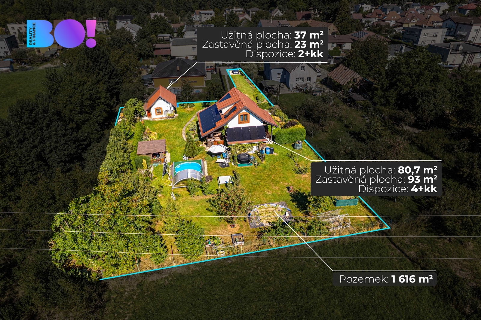 Nabízíme středně velký moderně stavěný cihlový rodinný dům s fotovoltaikou s nádherně upravenou zahradou s altánkem, krytým bazénem a druhým menším domem v rohu zahrady. Petřvald je klidná obec - ideální pro rodiny, seniory i "home office lidi" - a není to žádná „dědina bez duše“. Je tu komunita, zázemí, akce. Malá obec znamená také nízkou kriminalitu a je ideální pro děti. Na rozdíl od Ostravy, která je autem do 15 minut, je tu čistší vzduch, méně hluku. Rodinný dům o dispozici 4+kk, s obytnou užitnou plochou 80,7 m2, nabízí útulné bydlení s výhledem do zeleně z každého okna. V horním patře je ložnice, otevřený pokoj/pracovna se šatnou a koupelna. V přízemí je obývací pokoj, pokoj/zimní zahrada (vytápěný, okna dvojskla - ve videu chybně trojskla), kuchyň, koupelna a zádveří. Z jižní strany domu jsou přistavěny skladovací prostory. Fotovoltaika má výkon 10 kWp a bateriové úložiště kapacitu 20 kWh, měsíční náklady na provoz energií domu neuvěřitelně nízké - 3000 Kč / měsíčně. Součástí je nabíječka pro elektromobil. Opečovávaná zahrada s ovocnými keři a stromy má okrasnou, užitkovou a odpočinkovou část s krytým bazénem a s altánek dovolující posezení ve stínu. Zděný domek v rohu zahrady může po dokončení sloužit k celoročnímu bydlení anebo ihned pro podnikání v drobných službách. K nastěhování v červenci 2026 nebo i dřív, pokud se majitelce podaří urychlit rekonstrukci nového bydlení. Rodinný dům a malý domek ----------------------------------------- Pozemek: Rovinatý, slunný, 1616 m2